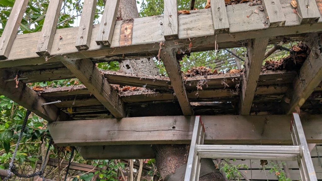 10 years isn’t bad for a small project like that to last; had I done the math I could have predicted that the life of a treehouse for my kids would be less than 10 years. I think of my childhood sandbox and jungle gym, and remember them better as rusted ruins considered from young adulthood than I remember using them in their prime. Though there was that one time I clamped an electric light onto a pipe of the climbing structure and set the sprinkler on it, to recreate the colorful fountains of an amusement park that caught my fancy. That was nearly my last creative endeavor, but the power shorted out and I lived to see another day.